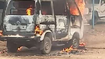 टक्कर में गई दो जिंदगियां, उग्र भीड़ ने जलाई वैन, इलाके में तनाव